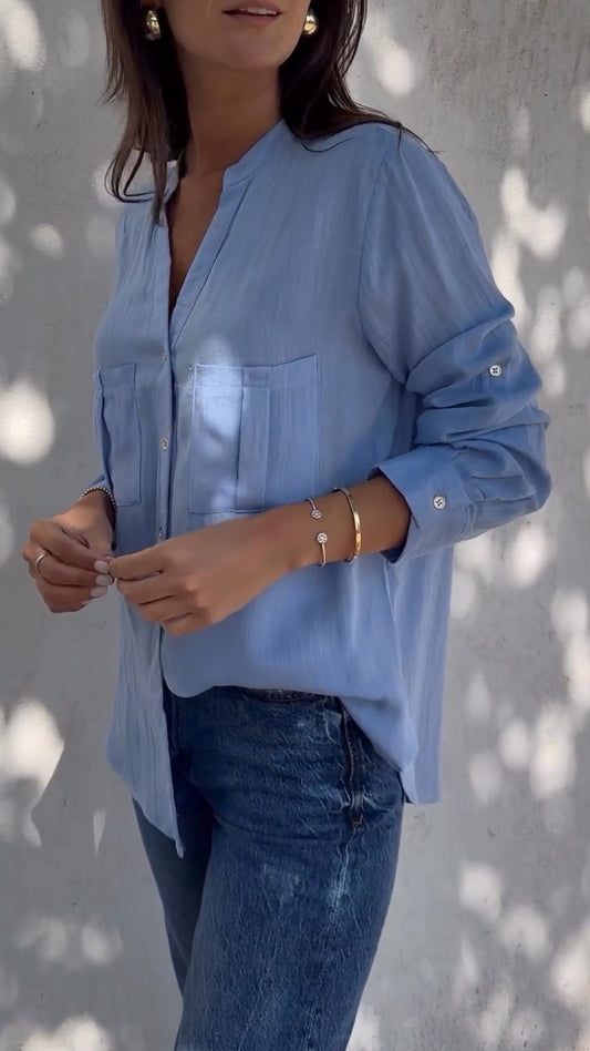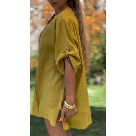 Camisa Casual de Algodão e Linho com Decote em V
