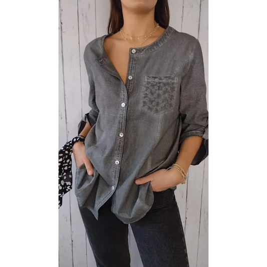 Camisa casual feminina de algodão e linho com design de botões