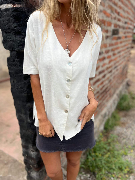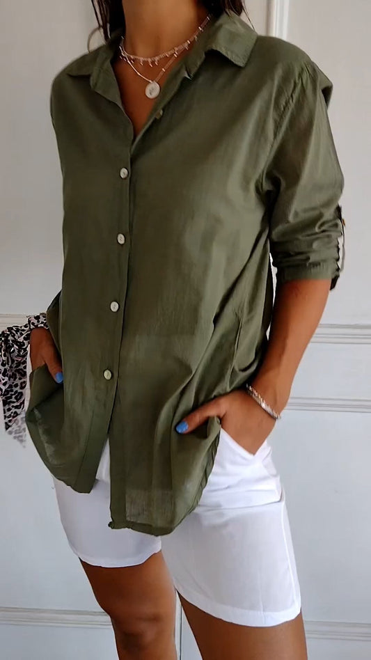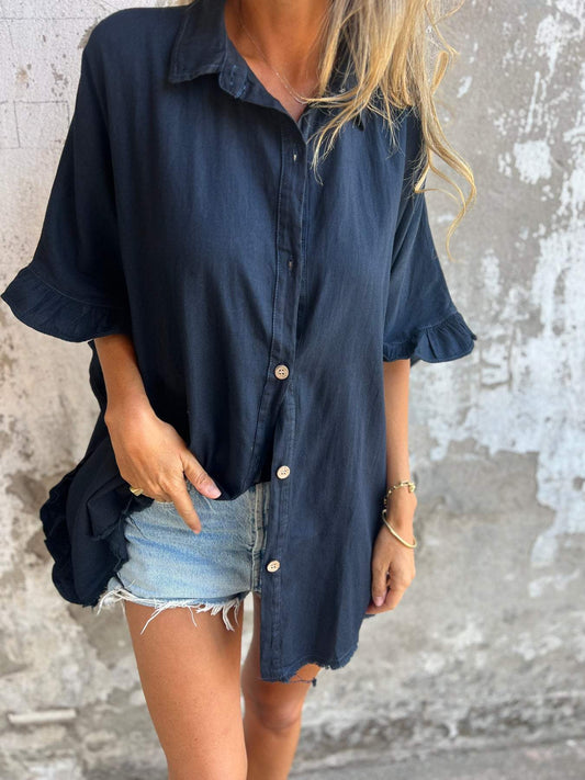 Camisa de Algodão e Linho com Lapela e Mangas 3/4