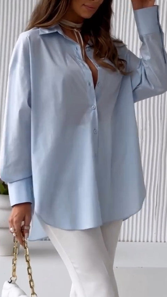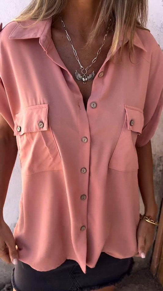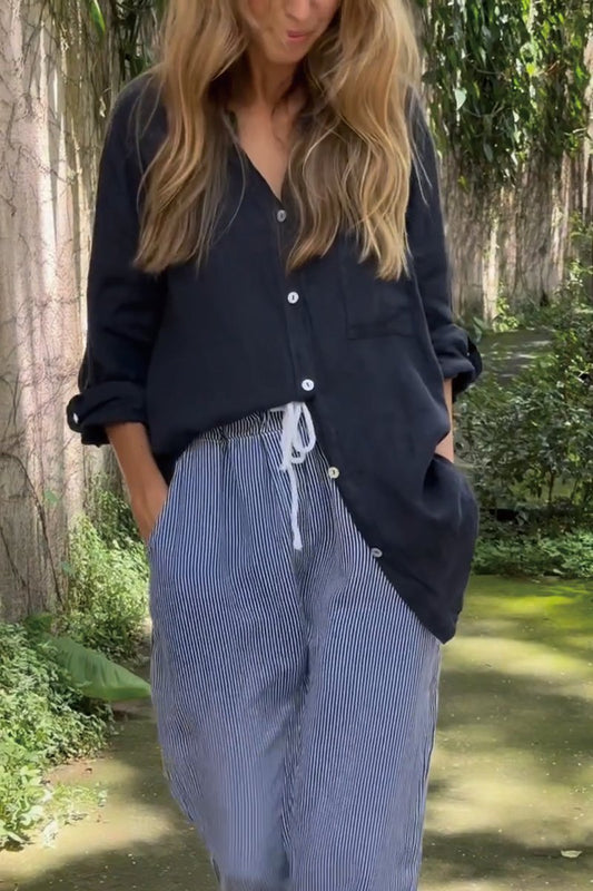 Camisa de Algodão e Linho com Lapela de Cor Sólida