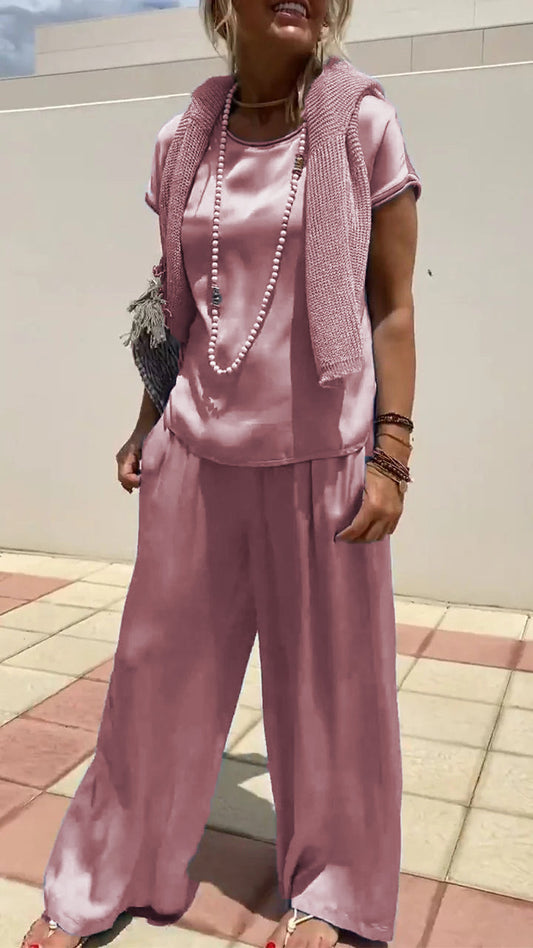 Conjunto de Dos Piezas de Satén con Cuello Redondo y Manga Corta