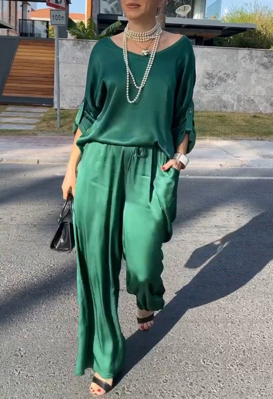 Conjunto de Dos Piezas de Satén con Cuello Redondo y Manga Media