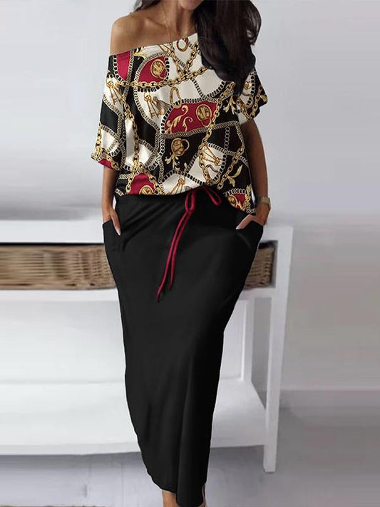 Conjunto de Falda Casual y Estampada con Escote de Hombro a Hombro