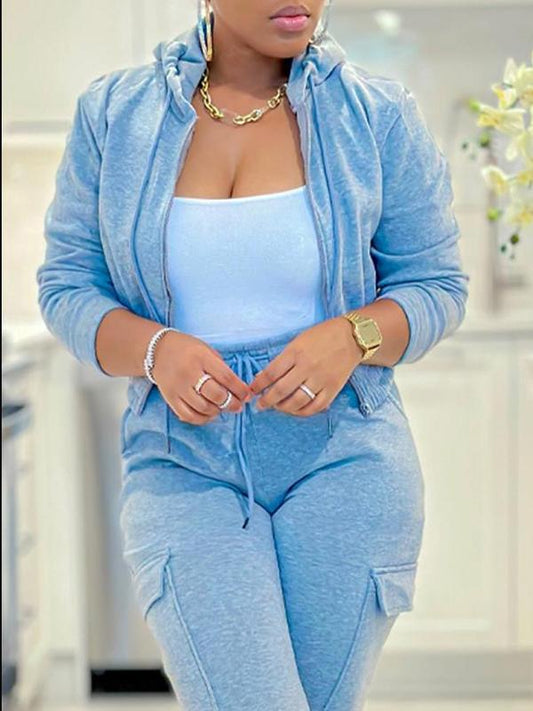 Conjunto Femenino Casual de Chaqueta con Cremallera y Cordón y Pantalones Cargo con Múltiples Bolsillos