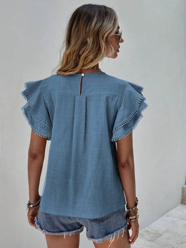 Esta camisa no es solo una prenda de ropa; es una declaración de estilo. Con sus mangas cortas terminadas con volantes delicados, ofrece un aspecto ligero y elegante. La combinación perfecta entre comodidad y feminidad, esta camisa está hecha para impresionar en cualquier ocasión.