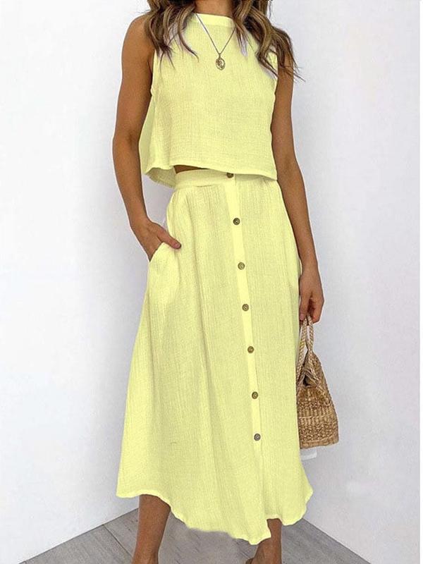Elegancia y Versatilidad: Conjunto con Camiseta sin Mangas y Vestido con Botones
