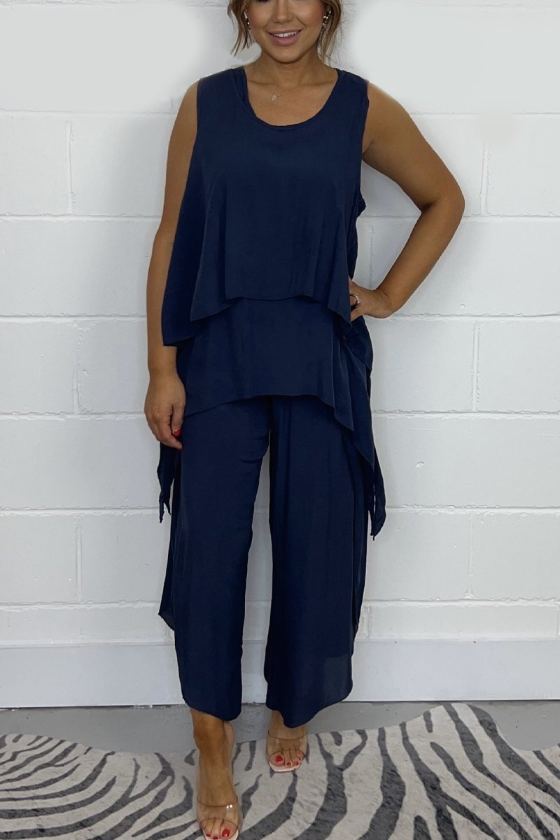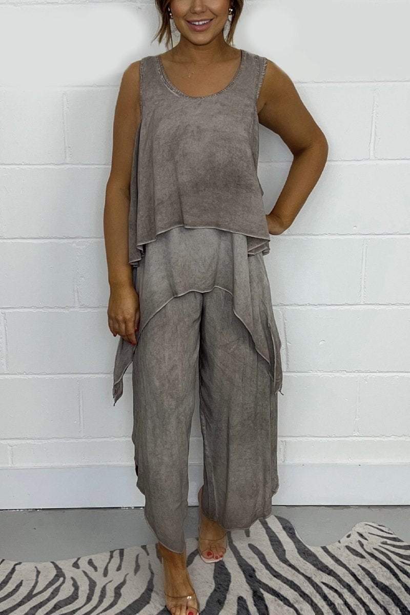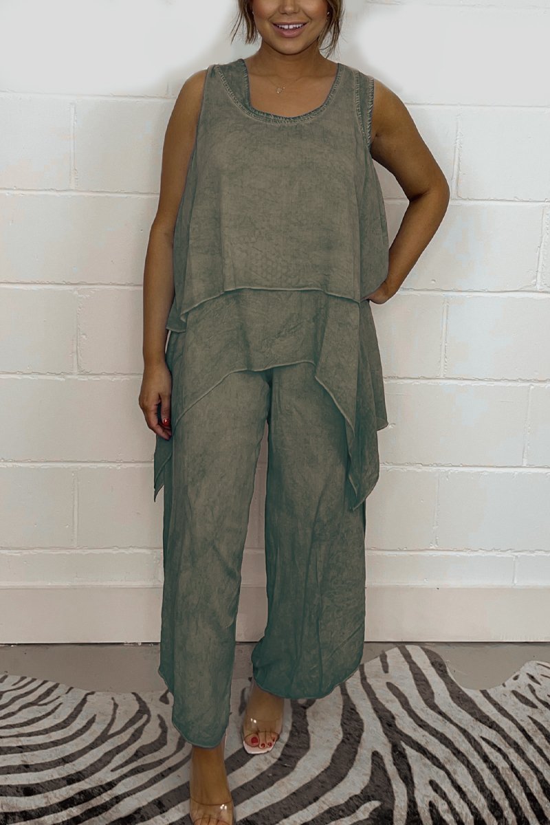El conjunto está compuesto por un top suelto sin mangas, que ofrece frescura y comodidad en los días más calurosos, y pantalones casuales que complementan el look con un corte ligero y suelto. El diseño simple y moderno hace de este conjunto una prenda versátil, fácil de combinar con diferentes accesorios y calzado, creando looks variados para el día a día.