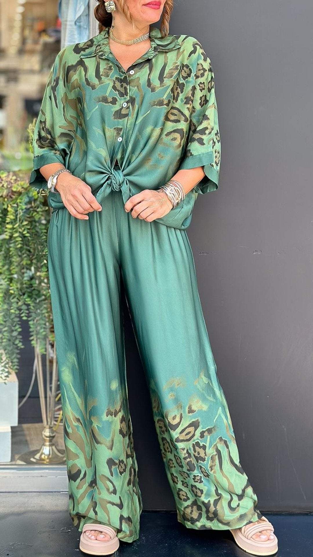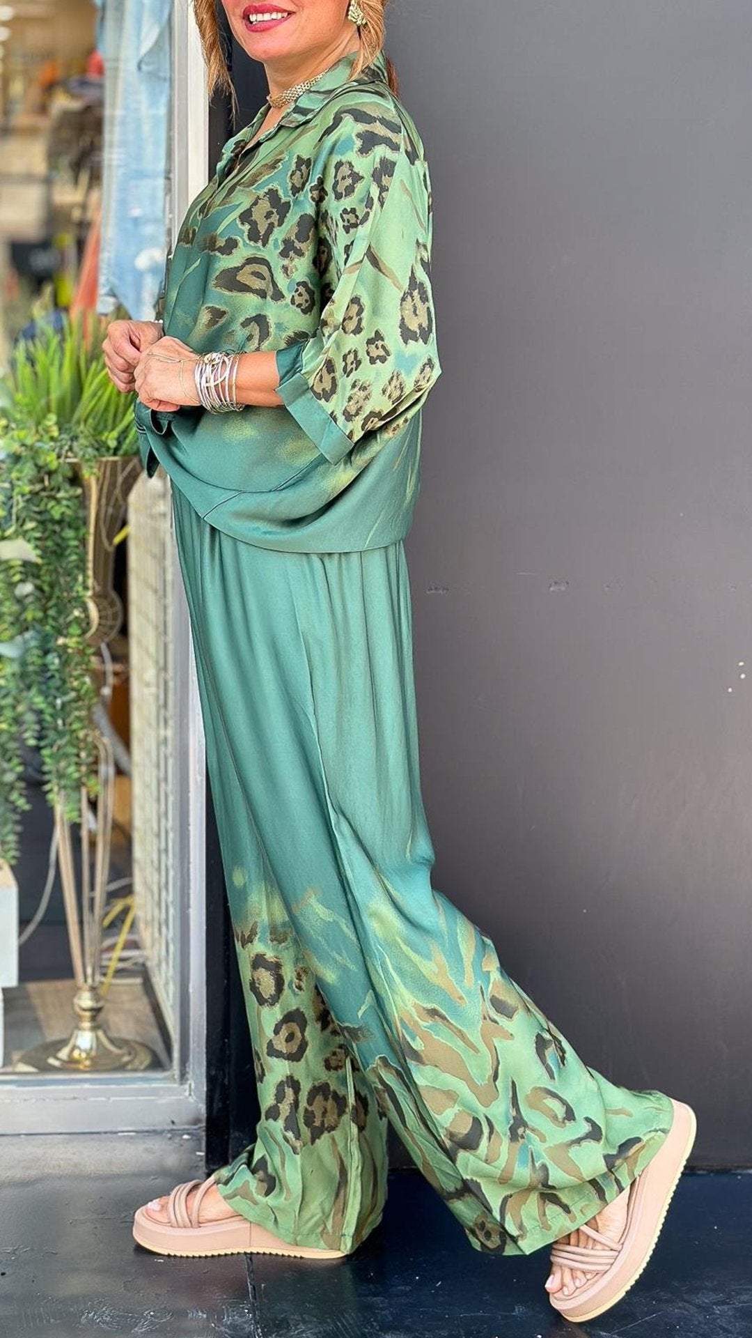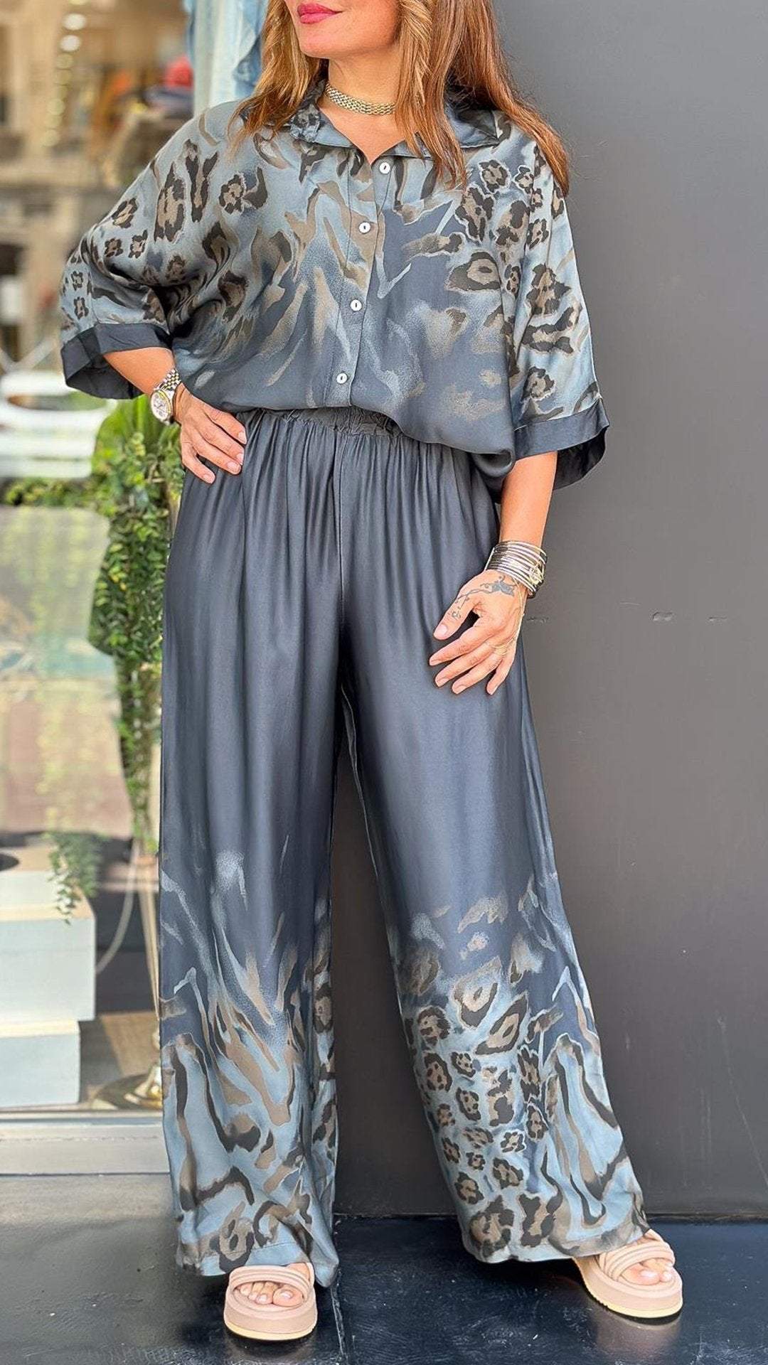 El conjunto está compuesto por una blusa con solapa, que ofrece un toque de elegancia y estructura al look, y un estampado de leopardo gradiente que brinda una sensación dinámica y moderna. Los pantalones acompañan el conjunto con un corte cómodo, proporcionando libertad de movimiento y un toque de sofisticación. Este conjunto es perfecto para quienes desean destacarse con un look atrevido y estiloso.