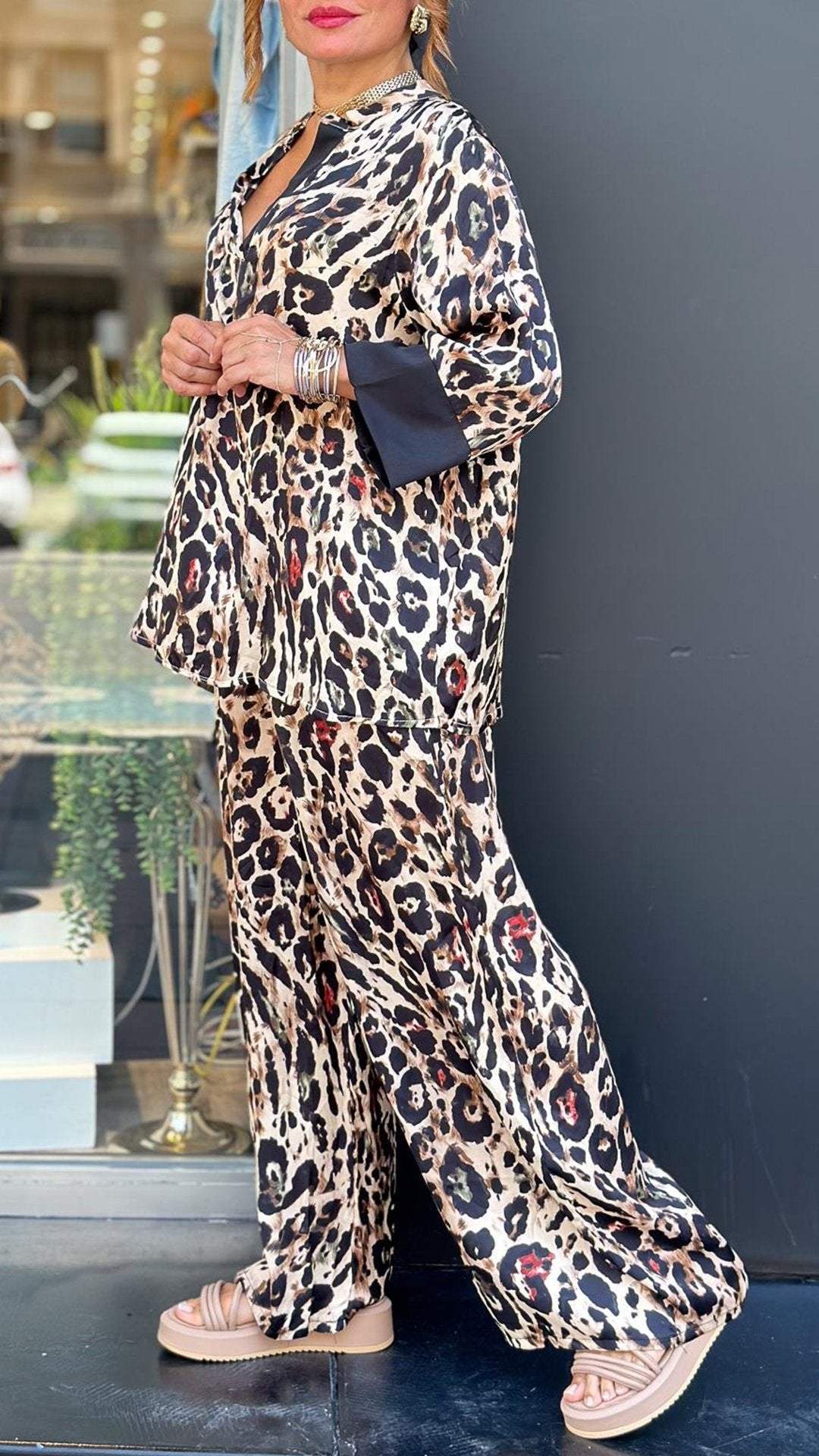 El conjunto está compuesto por una blusa con solapa y mangas medias, que proporciona un ajuste fluido y elegante, y un estampado de leopardo que confiere un look impactante y moderno. Los pantalones completan el look con un ajuste cómodo y práctico, perfecto para garantizar libertad de movimiento sin perder el estilo. Este conjunto es ideal para quienes buscan una combinación de comodidad, elegancia y audacia.