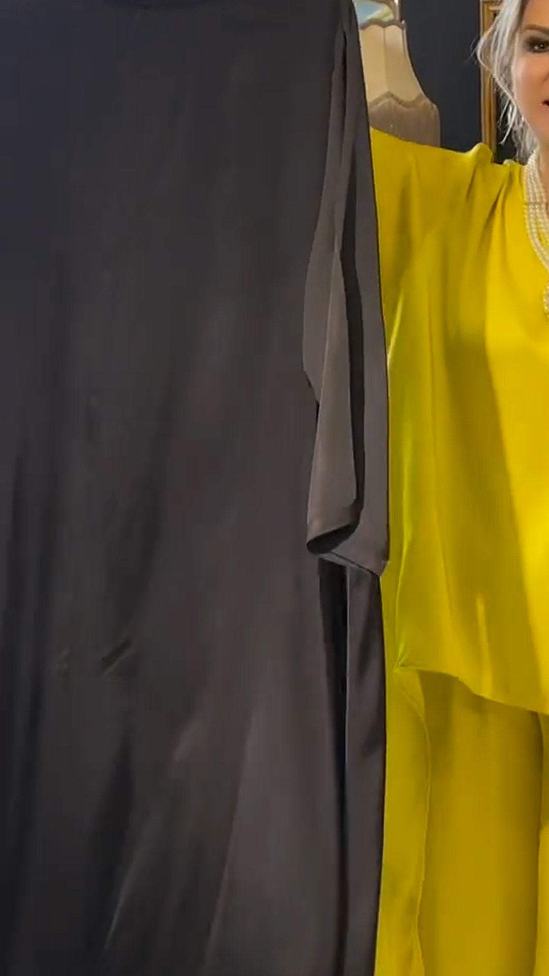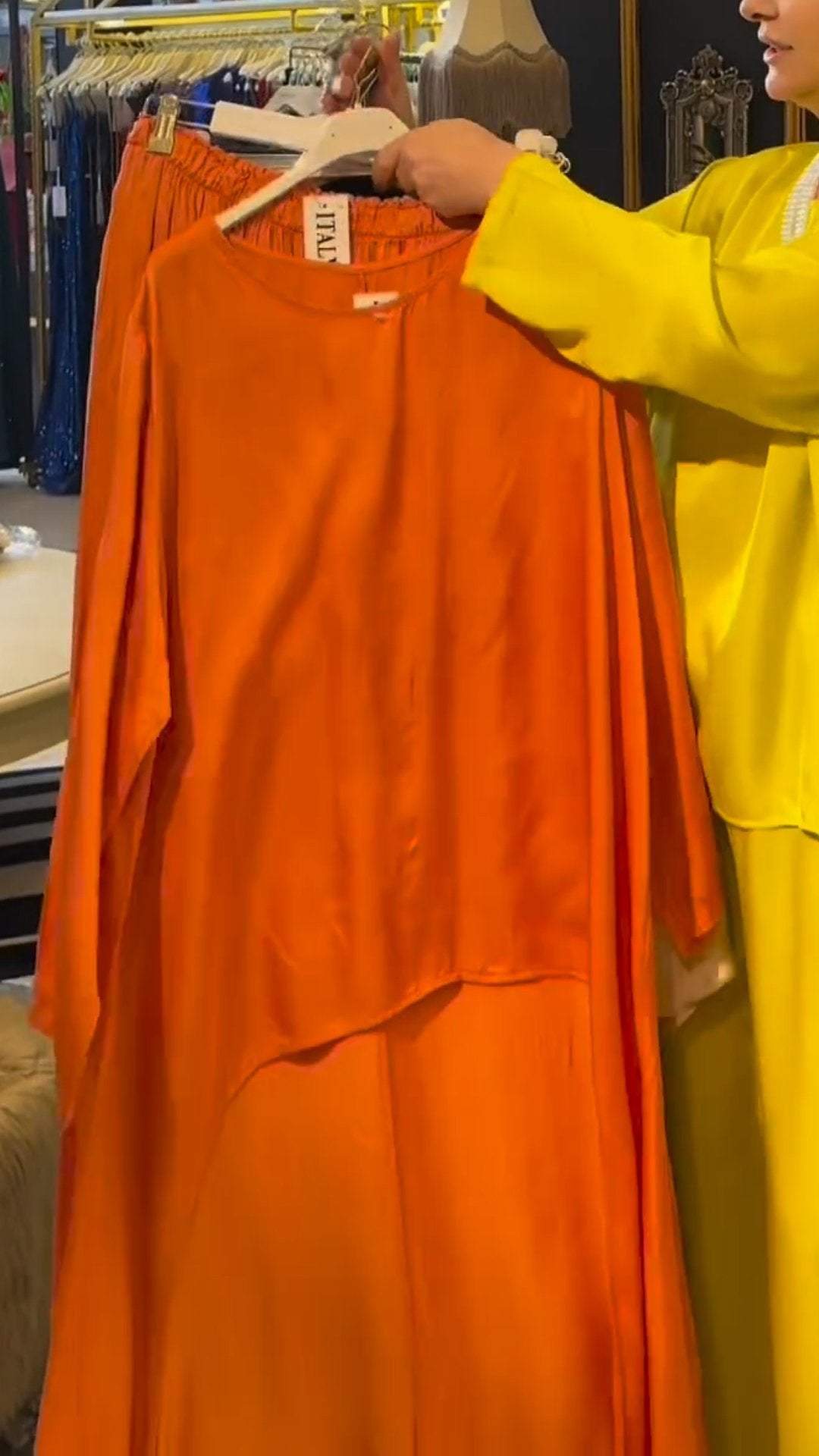 El conjunto está compuesto por una blusa de color sólido con frente corta y espaldas largas, que crea un efecto visual moderno y sofisticado, y pantalones de corte recto que proporcionan comodidad y elegancia. El diseño asimétrico de la blusa añade un toque audaz al look, mientras que el color sólido mantiene la versatilidad, permitiendo diversas combinaciones para crear diferentes estilos.