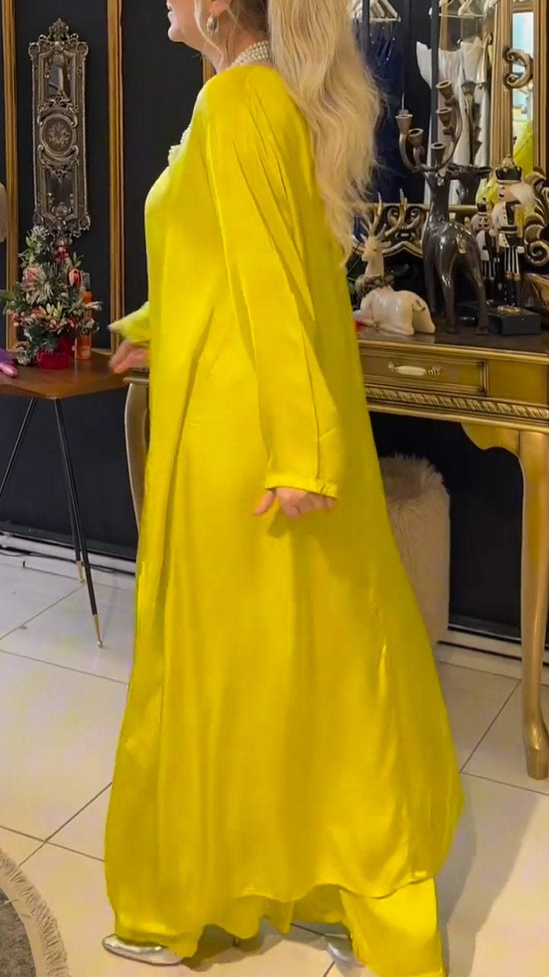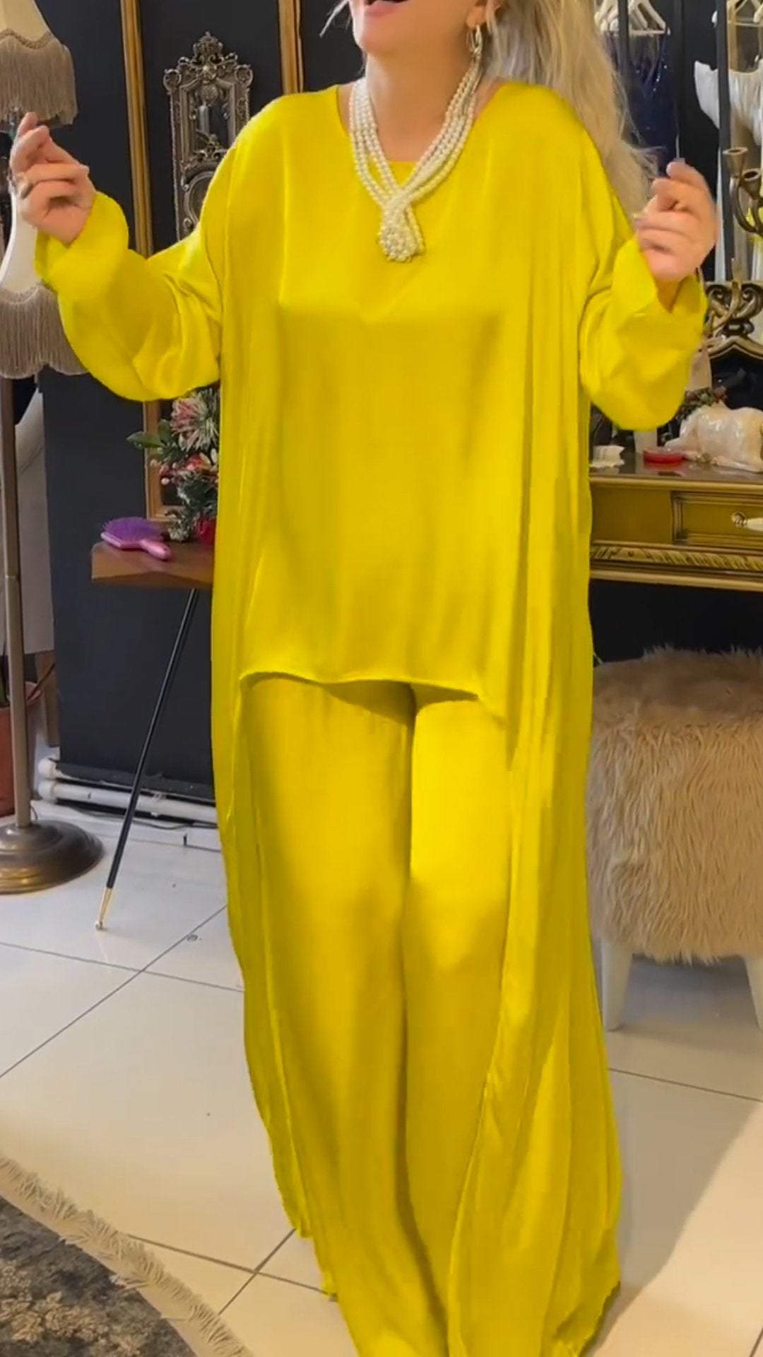 El conjunto está compuesto por una blusa de color sólido con un diseño limpio y elegante, acompañada de un pantalón de corte recto que proporciona un ajuste perfecto. El amarre en la cintura permite ajustar el conjunto al cuerpo, destacando la silueta de forma sutil y sofisticada. El color sólido hace de este conjunto una prenda versátil y fácil de combinar, ideal para quienes buscan un look práctico y estiloso.