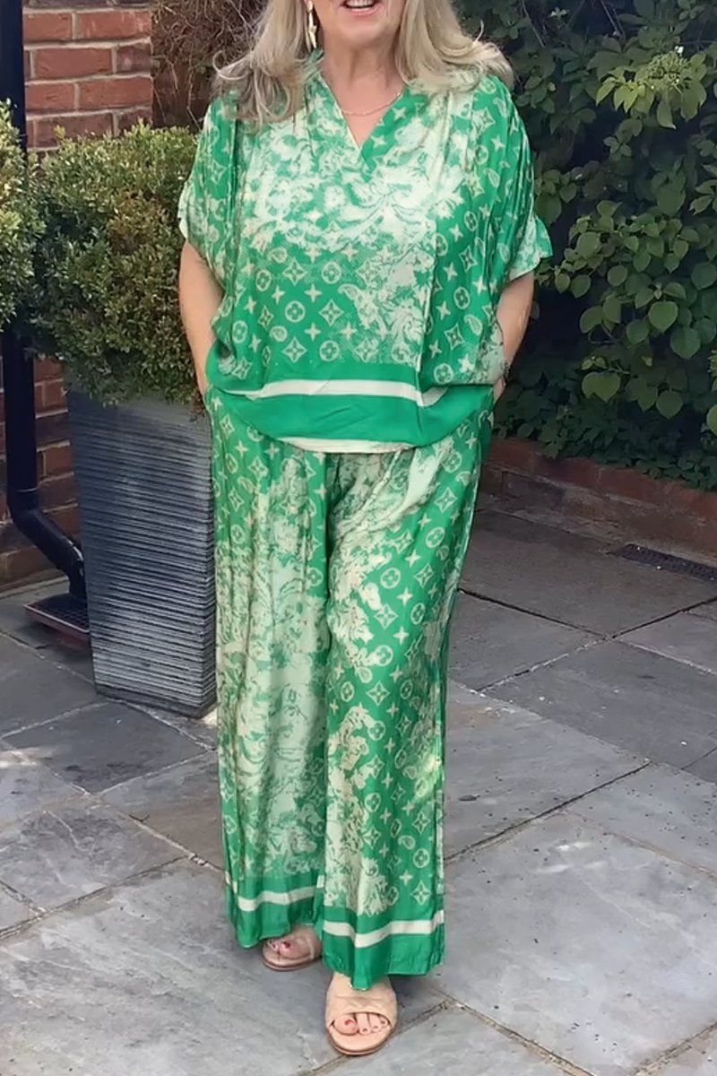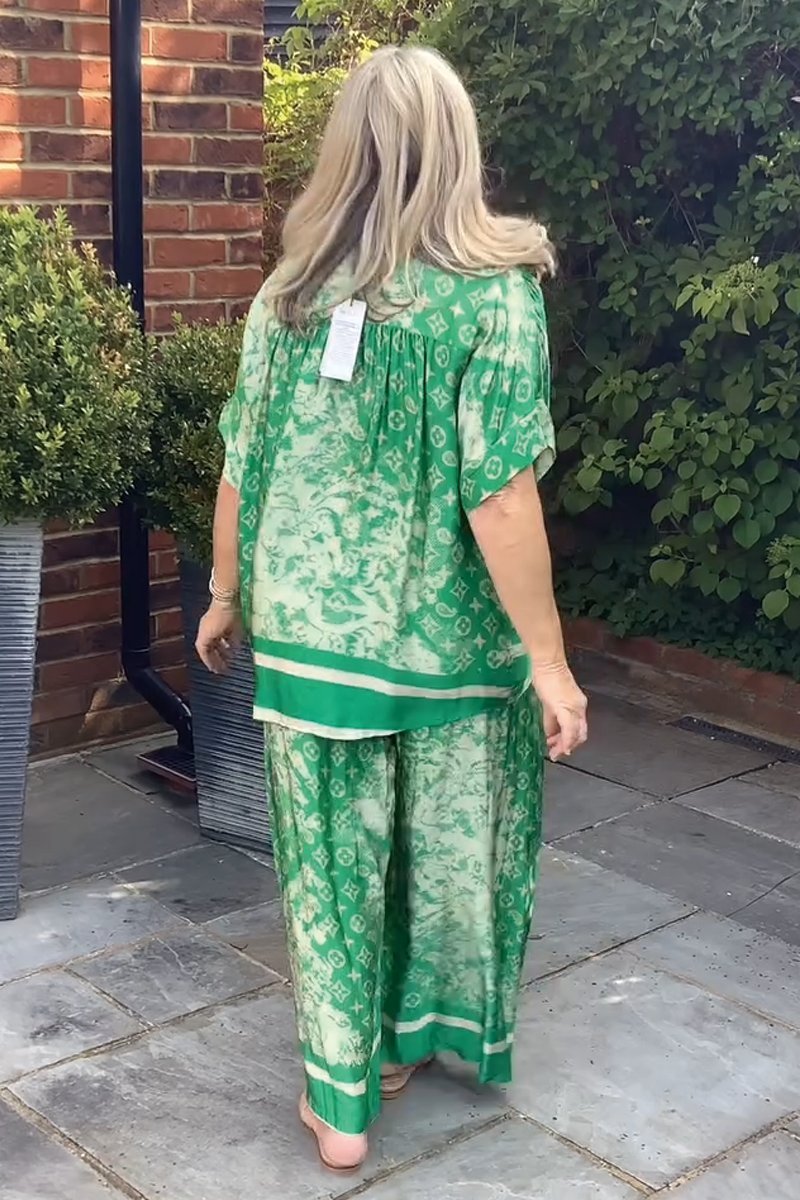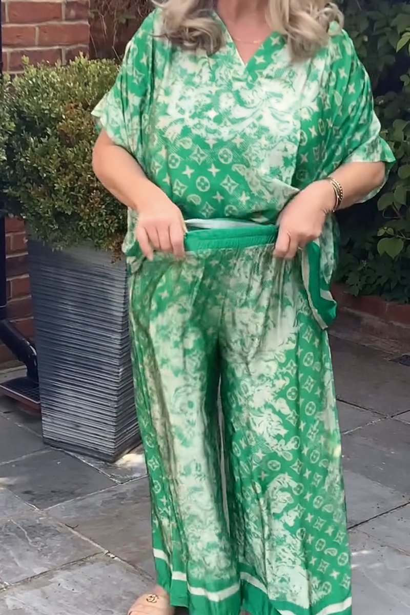 El conjunto está compuesto por una blusa de satén con estampado elegante y pantalones de satén que garantizan un look cohesivo y estiloso. Los estampados aportan un toque de modernidad y exclusividad, mientras que el tejido ligero y fluido ofrece comodidad y frescura, ideal para días más cálidos o eventos donde el estilo es esencial.