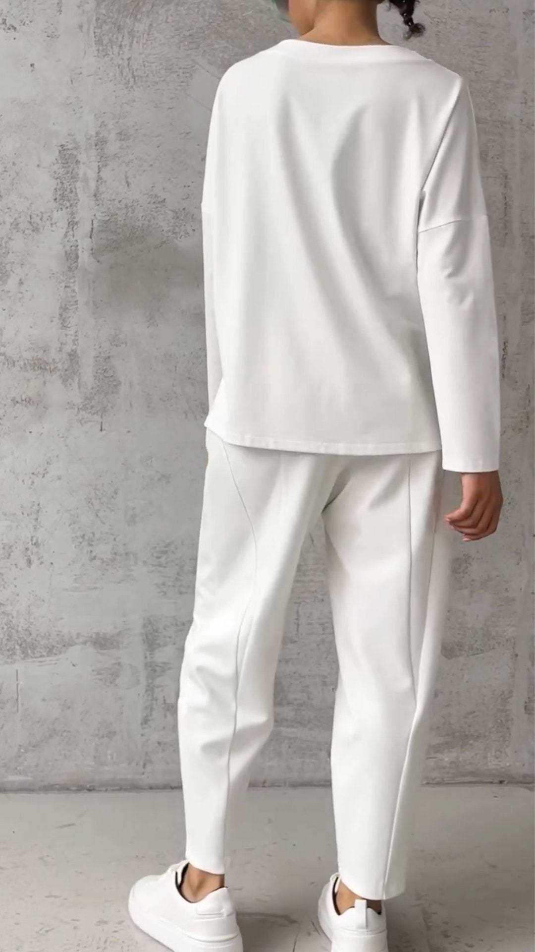 El conjunto está compuesto por una blusa cómoda con cuello redondo y un corte que realza la silueta, además de pantalones con aberturas que añaden un toque moderno al look. La tela ligera y transpirable proporciona confort durante todo el día, mientras que el diseño con abertura en los pantalones ofrece un diferencial elegante y estiloso.