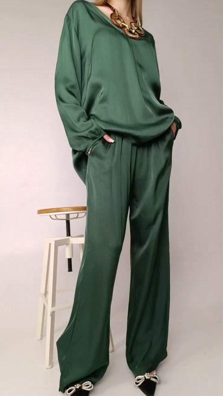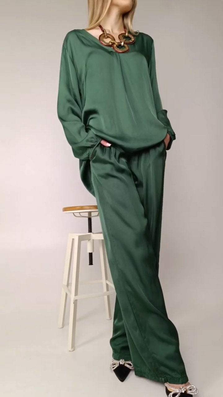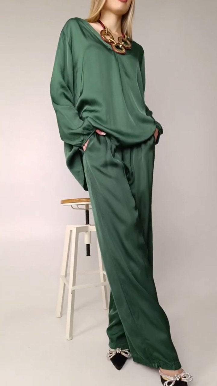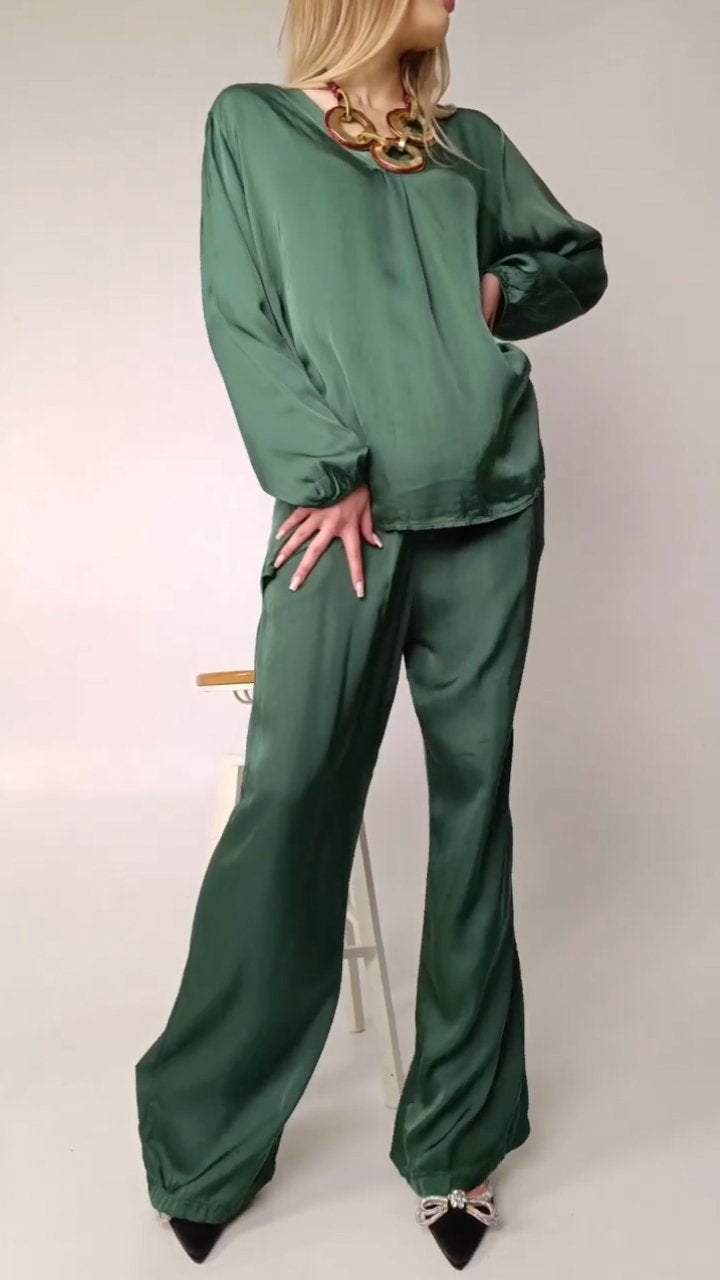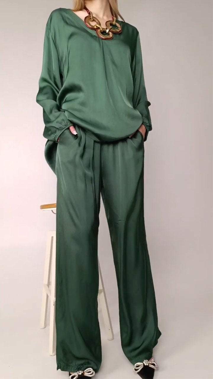 El conjunto está compuesto por una blusa de satén con cuello redondo y mangas largas, proporcionando un look elegante y atemporal. Los pantalones, hechos del mismo material, ofrecen una caída suave y cómoda, perfecta para el día a día o para ocasiones especiales. El brillo discreto del satén confiere un toque de lujo, mientras que el diseño simple garantiza versatilidad y practicidad.