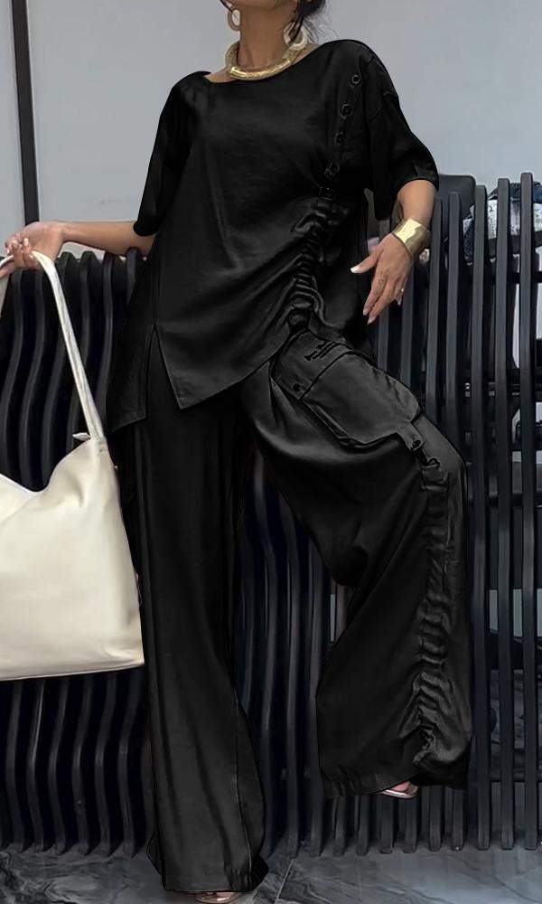 El conjunto está compuesto por un top de corte ajustado que realza la silueta y pantalones de corte suelto que garantizan libertad de movimiento. El diseño simple y elegante hace de este conjunto una elección versátil, ideal para cualquier estación. Ya sea para un paseo casual o para relajarse en casa, este conjunto ofrece la combinación perfecta de comodidad y estilo.