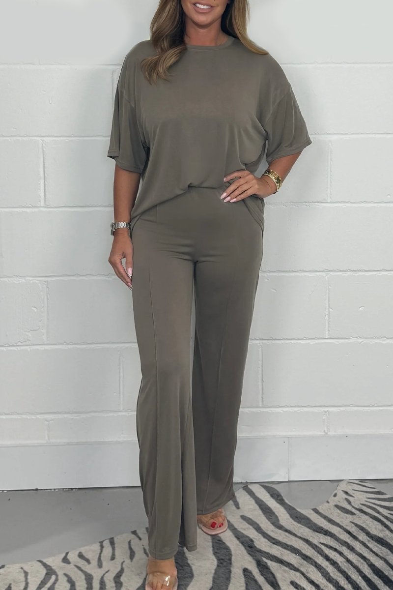 El conjunto está compuesto por una camiseta de corte elegante y pantalones con corte perfecto, garantizando comodidad absoluta. El tejido suave y acogedor proporciona una sensación de lujo en la piel, ideal para momentos de relajación con un toque de sofisticación. Con un diseño minimalista y atemporal, este conjunto es la definición de elegancia casual.
