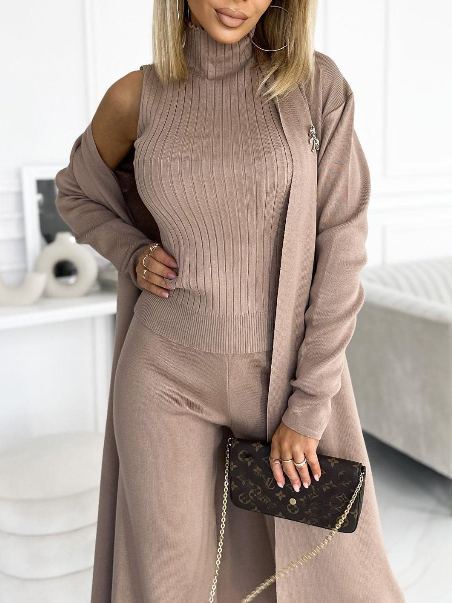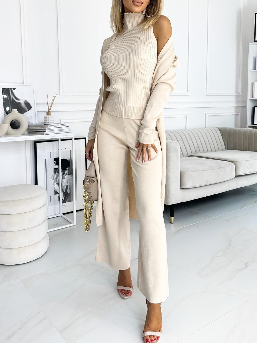 Estilo Completo: Conjunto Femenino de Cárdigan de Color Sólido con Top y Pantalones de 3 Piezas