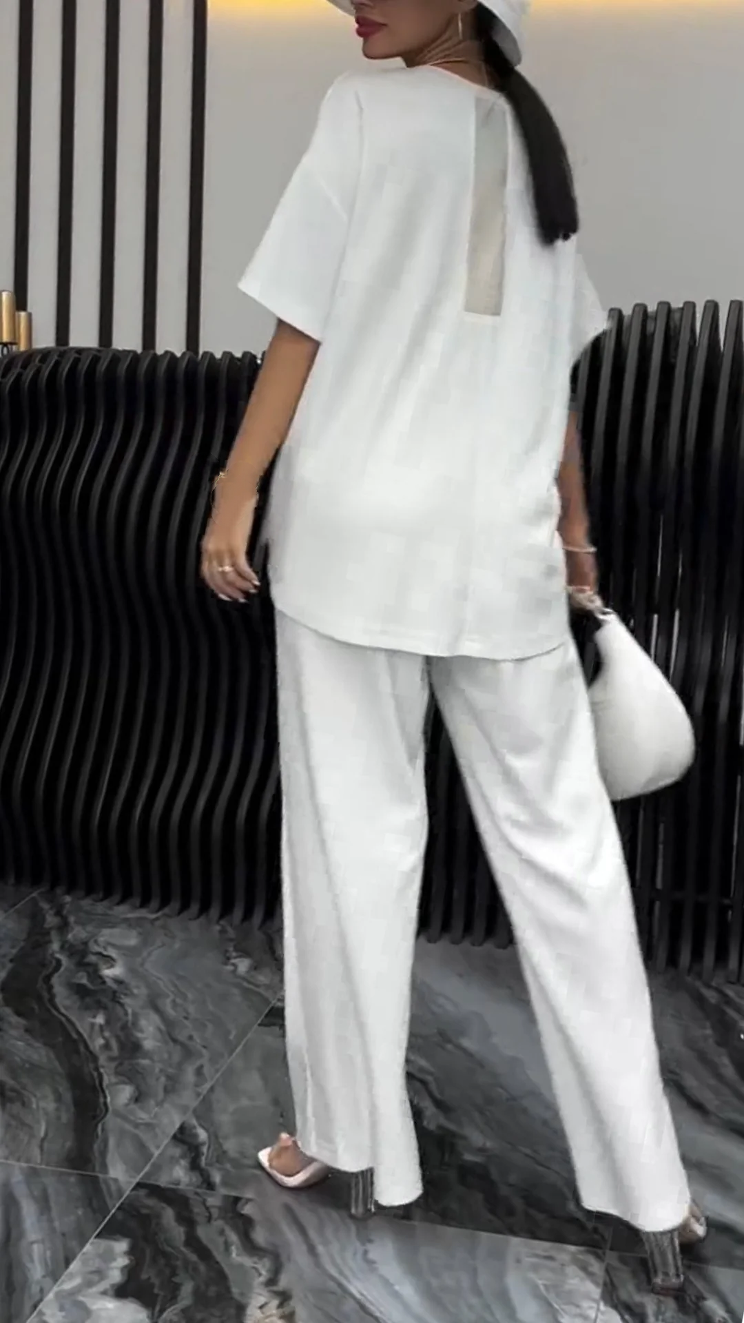 Este conjunto está compuesto por una blusa de manga corta con cuello redondo, que proporciona un ajuste suave y cómodo, combinado con pantalones o falda coordinada que complementa el visual de forma elegante. El tejido ligero garantiza frescura, mientras que el diseño limpio permite que lo uses en diversas situaciones, ya sea para un paseo relajado o una cita casual.
