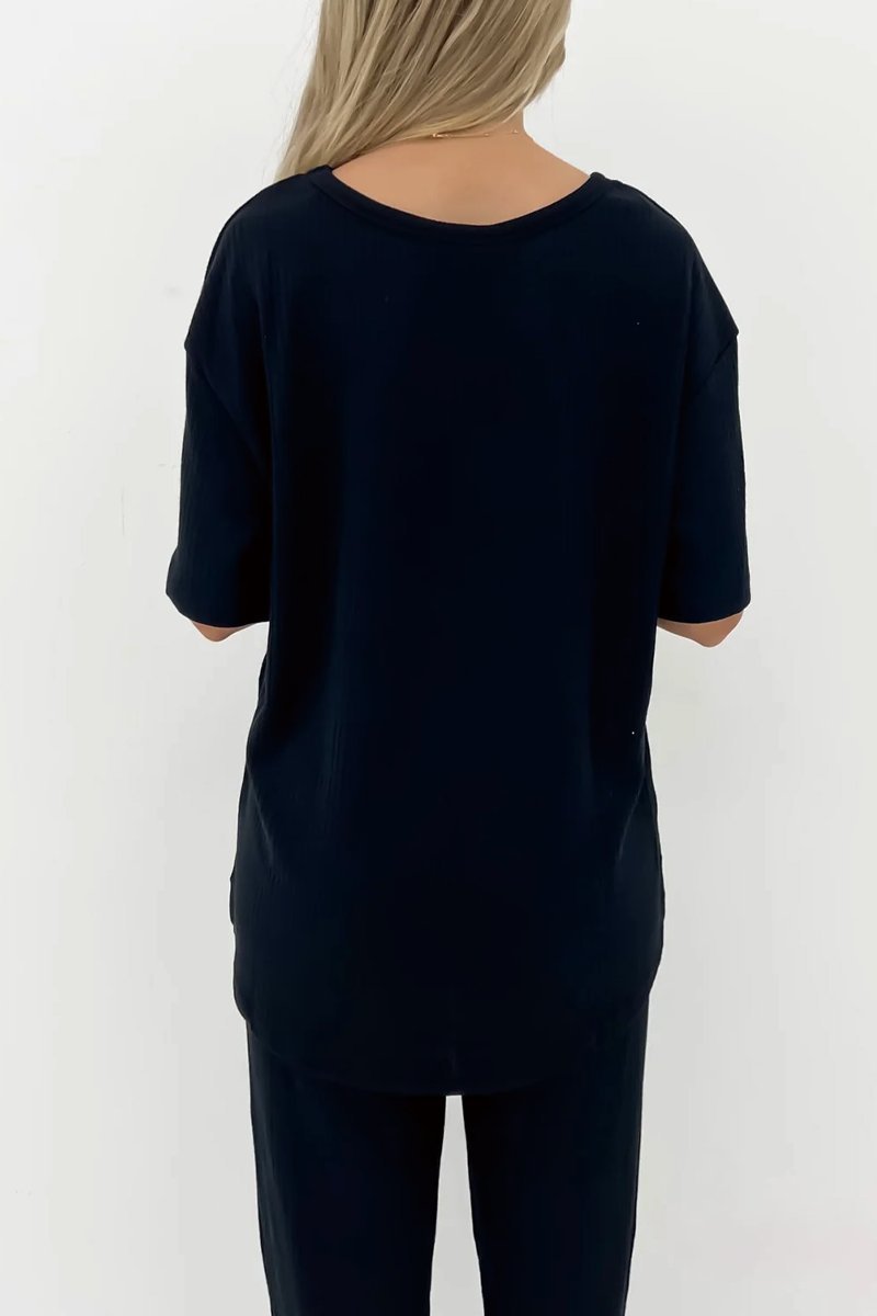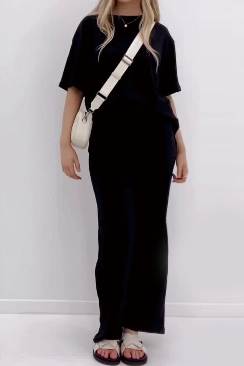 El conjunto está compuesto por un top canalé que se ajusta perfectamente al cuerpo, destacando las curvas de forma sutil y elegante. Los pantalones coordinados ofrecen un corte suelto, garantizando comodidad y libertad de movimiento a lo largo del día. El color sólido del conjunto facilita la combinación con diversos accesorios y calzado, convirtiéndolo en una prenda clave para tu guardarropa.