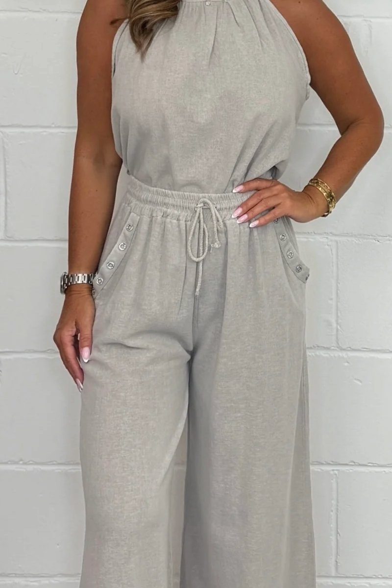 El top flotante, con su lazo delicado en la espalda, crea un visual ligero y sofisticado, perfecto para días más cálidos o eventos al aire libre. El pantalón con cuello halter complementa el conjunto, ofreciendo un ajuste fluido que alarga la silueta y confiere un toque de elegancia al look. La combinación de estos elementos convierte al conjunto en una elección versátil, que puede usarse tanto en ocasiones casuales como en eventos más formales.