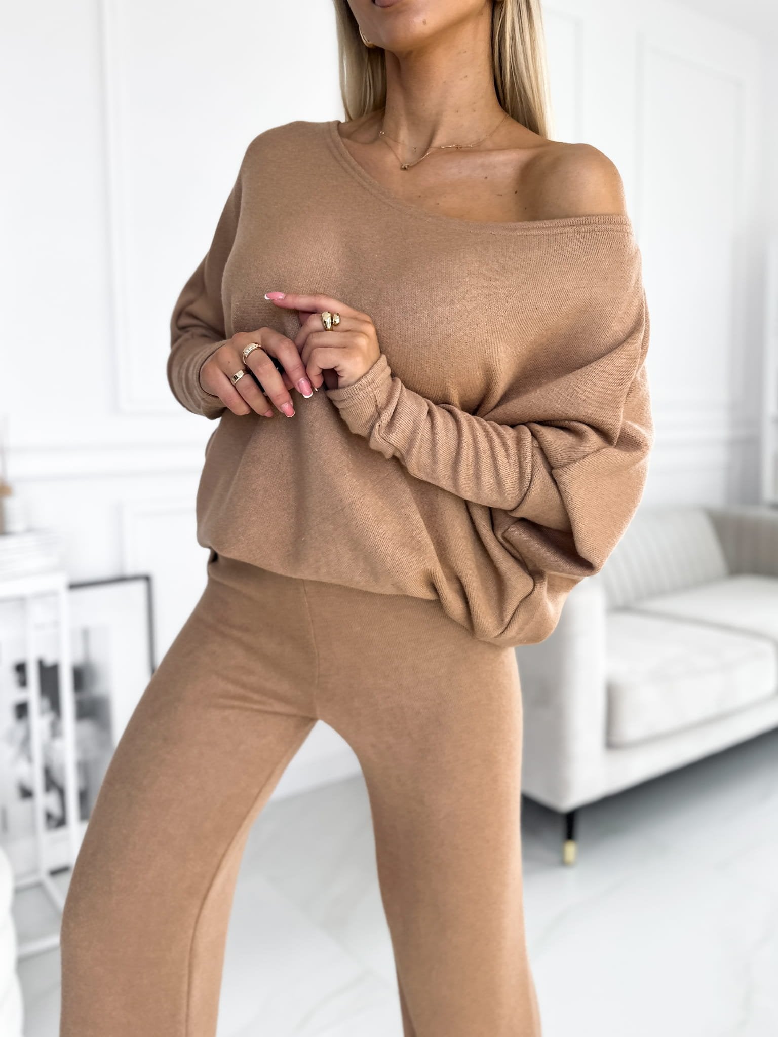 Estilo y Comodidad: Conjunto Femenino de Tops con Mangas de Murciélago y Pantalón de Pierna Ancha de Color Sólido