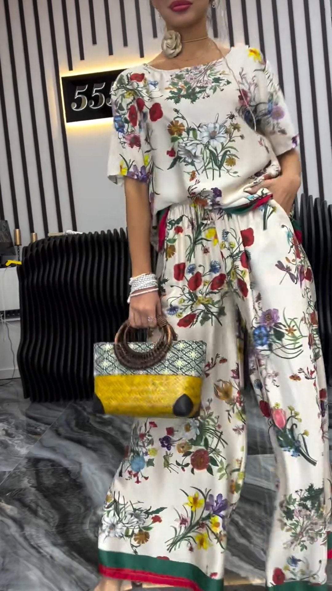 El top con cuello redondo y manga corta ofrece un look desenfadado y cómodo, mientras que el estampado delicado añade un toque de personalidad al conjunto. La combinación con el pantalón o la falda (dependiendo del modelo) crea un look armonioso y fácil de usar en diversas ocasiones. El tejido ligero y suave garantiza comodidad durante todo el día, haciendo de este conjunto una prenda esencial en tu guardarropa.
