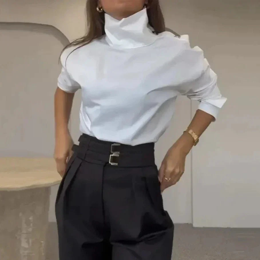 Elegancia Atemporal: Conjunto Femenino Social con Camisa de Manga Larga y Pantalón de Pierna Ancha