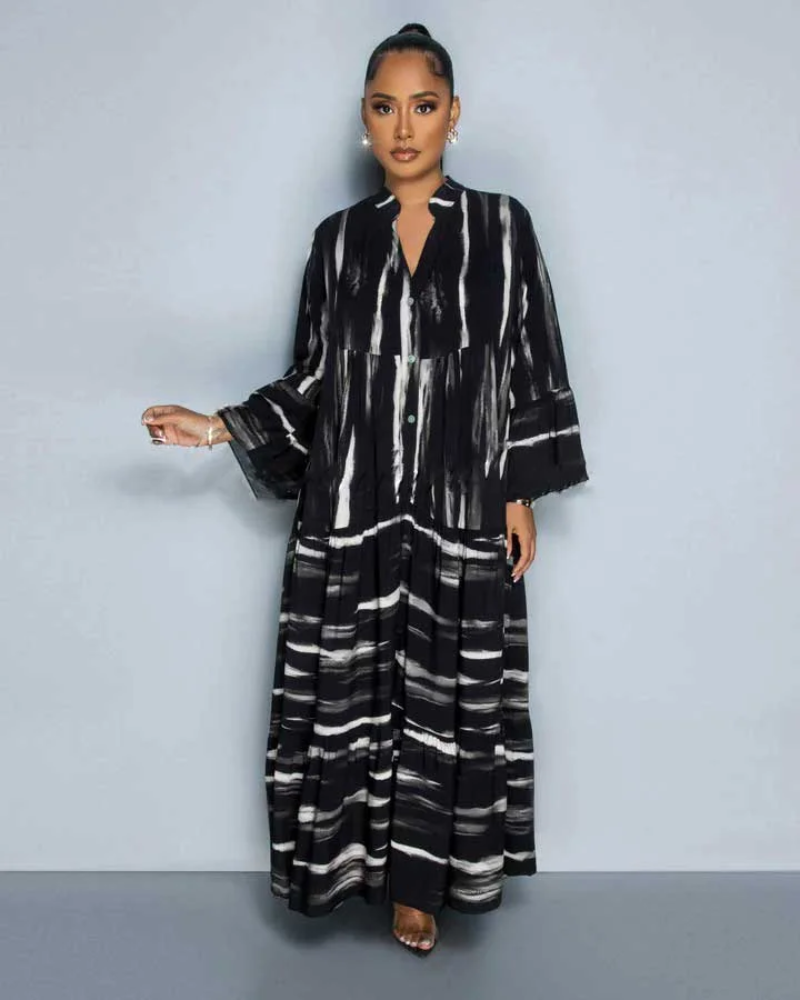 Affirmez votre style unique avec cette robe longue bohème saisissante, conçue pour captiver les regards. Sa silhouette fluide et son motif de coups de pinceau monochrome créent une allure artistique et moderne qui passe sans effort du jour à la nuit.
